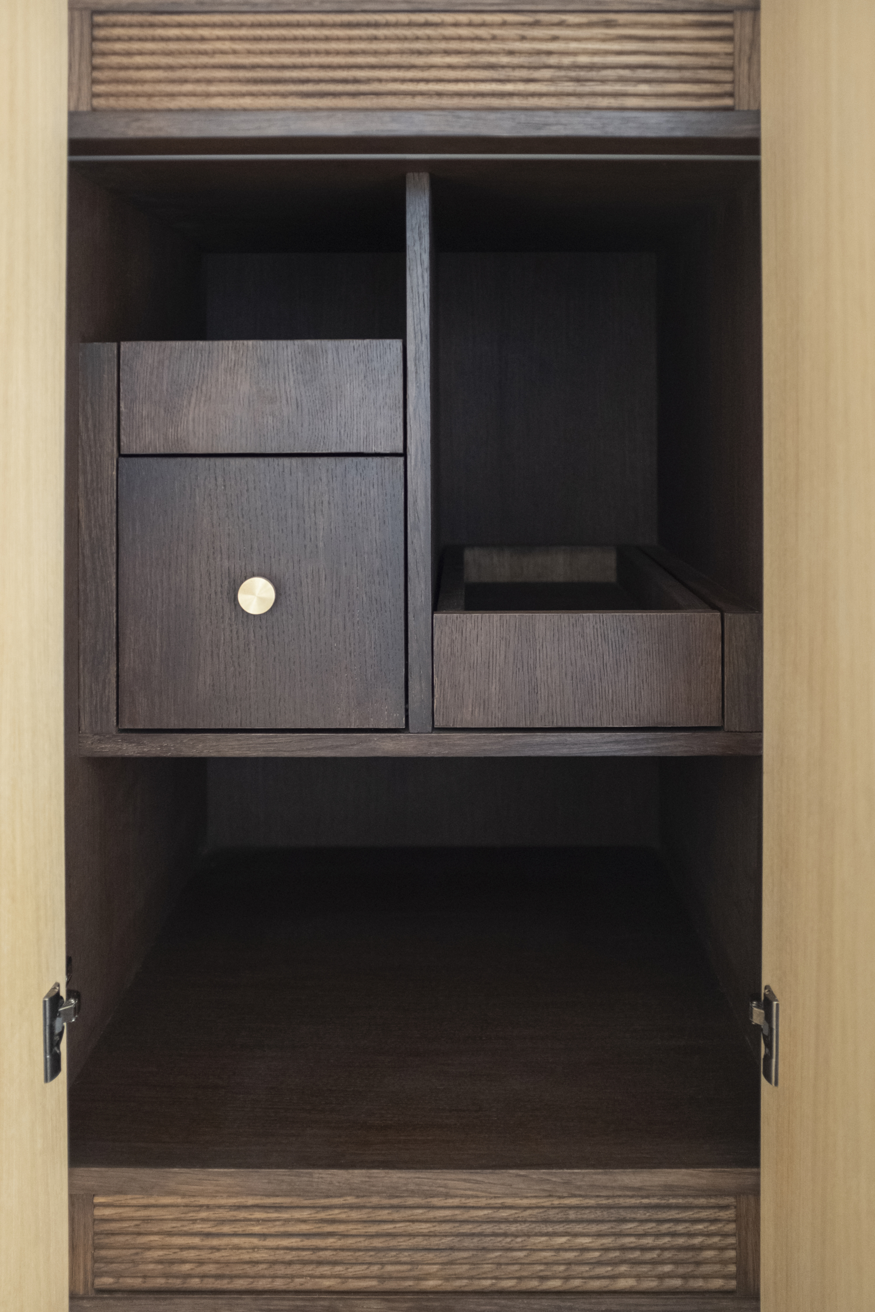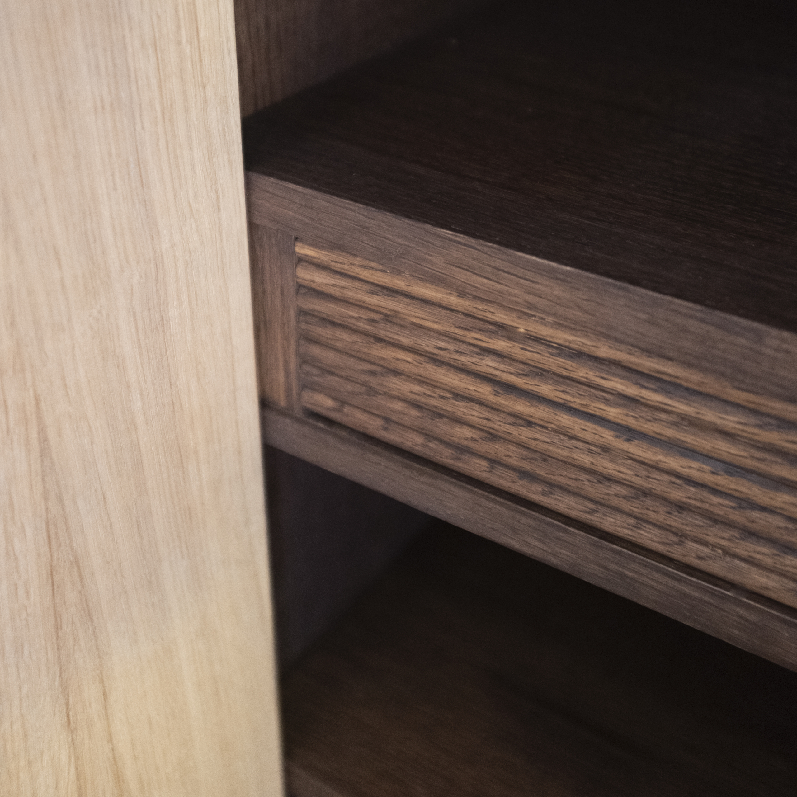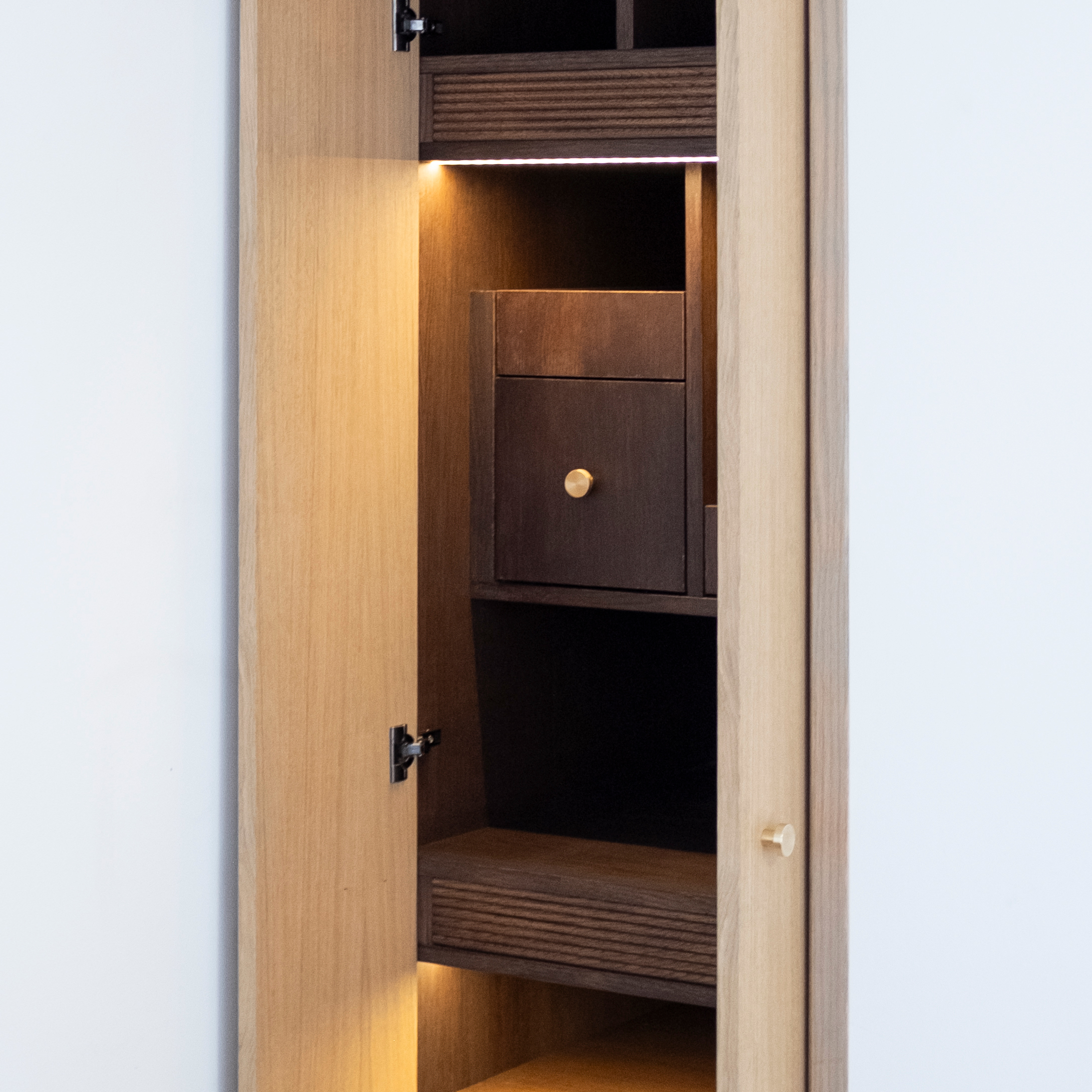 This custom-made piece showcases the craftsmanship of solid oak. Designed as a play of subtle openings and hidden compartments, it integrates seamlessly into the space.