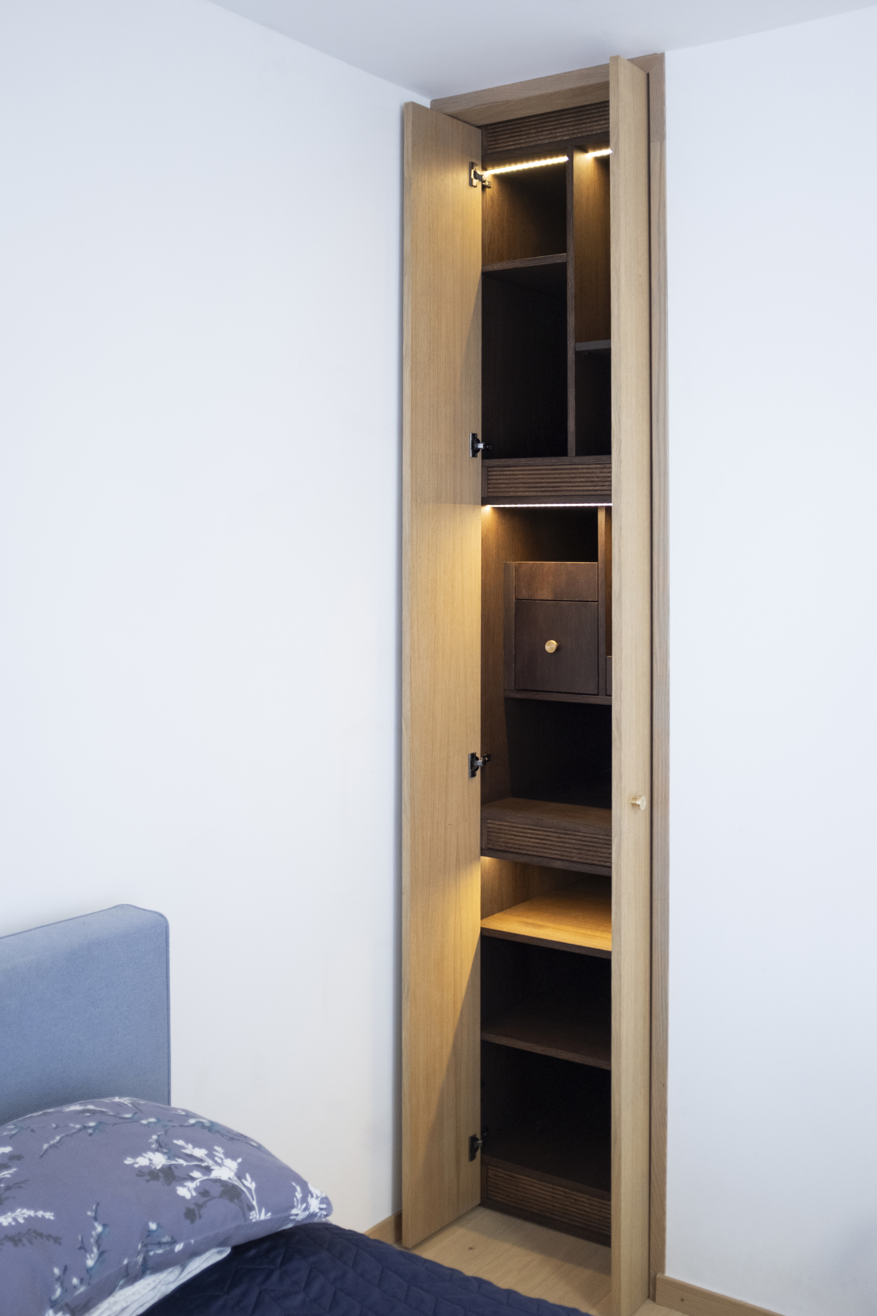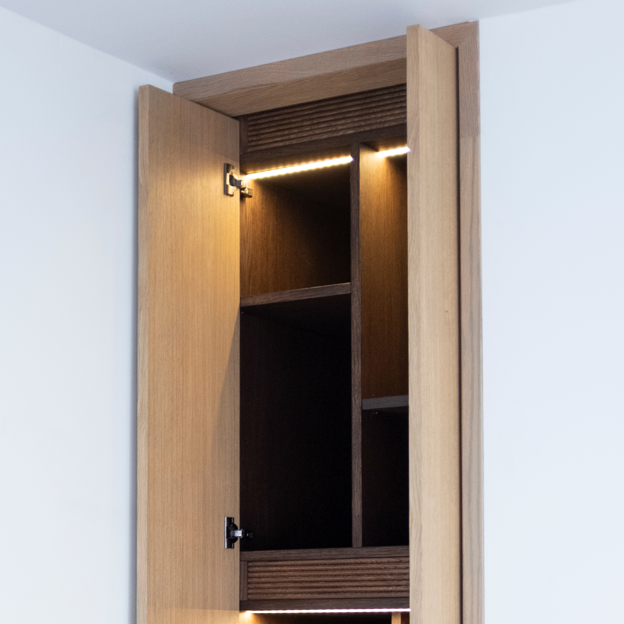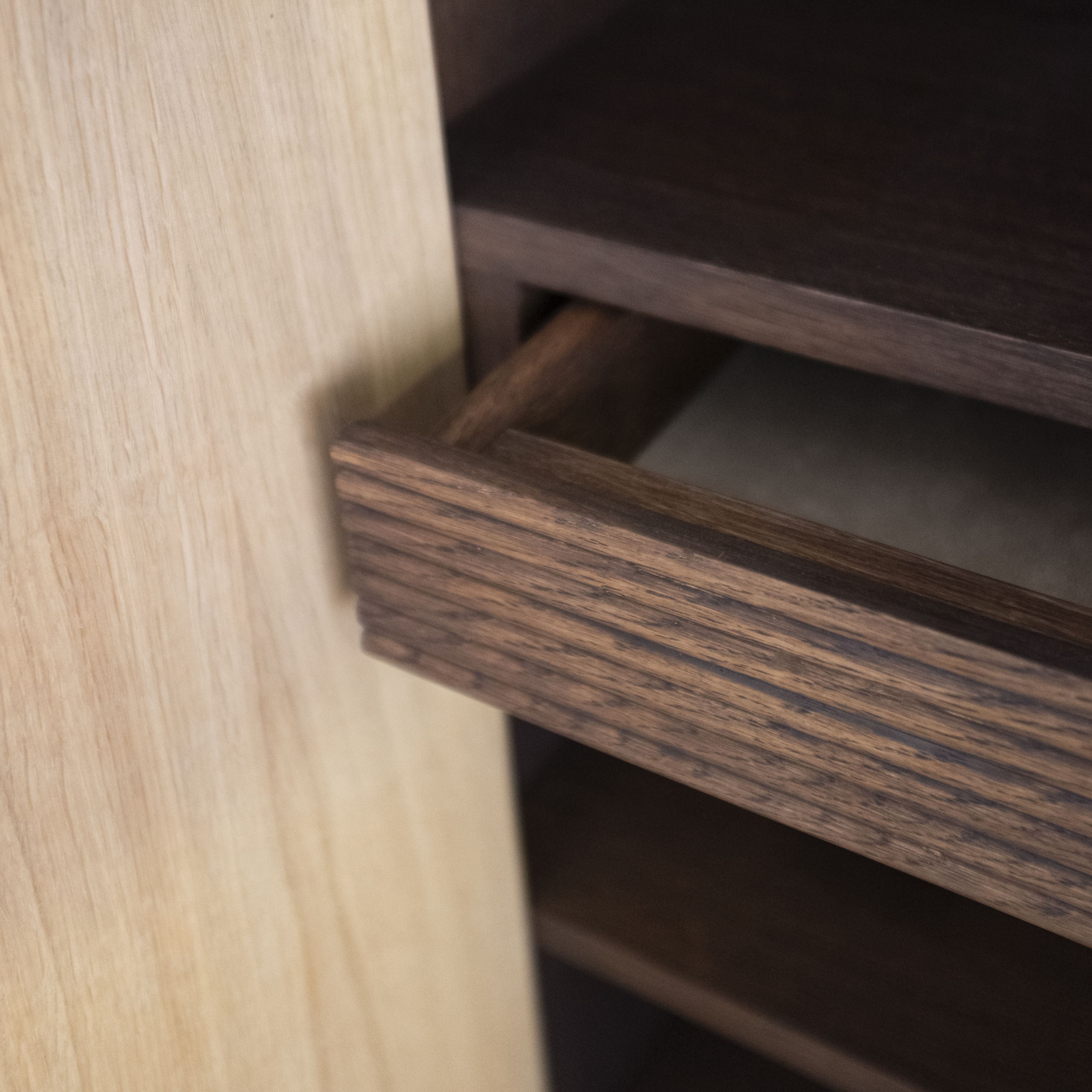 This custom-made piece showcases the craftsmanship of solid oak. Designed as a play of subtle openings and hidden compartments, it integrates seamlessly into the space.