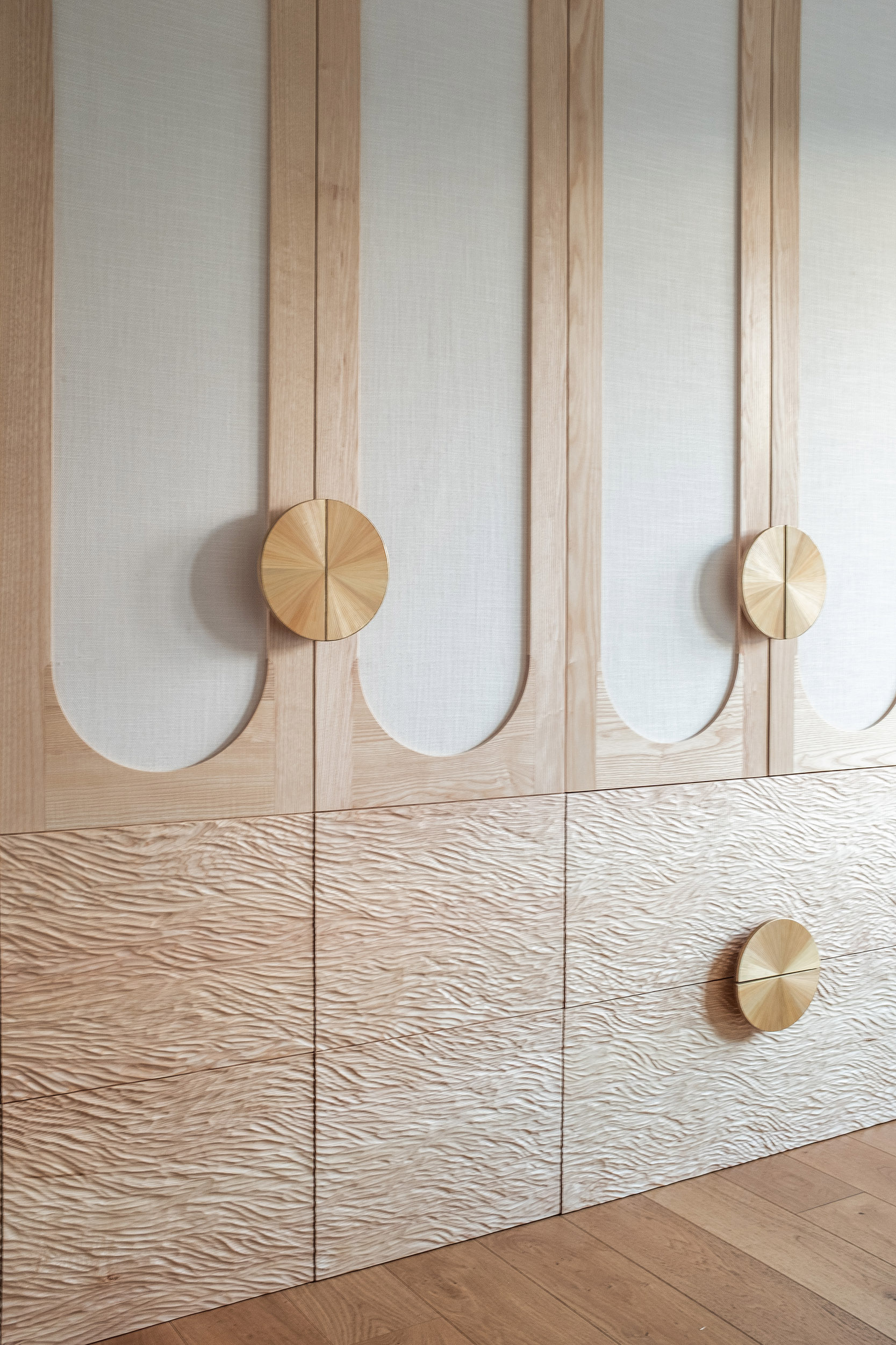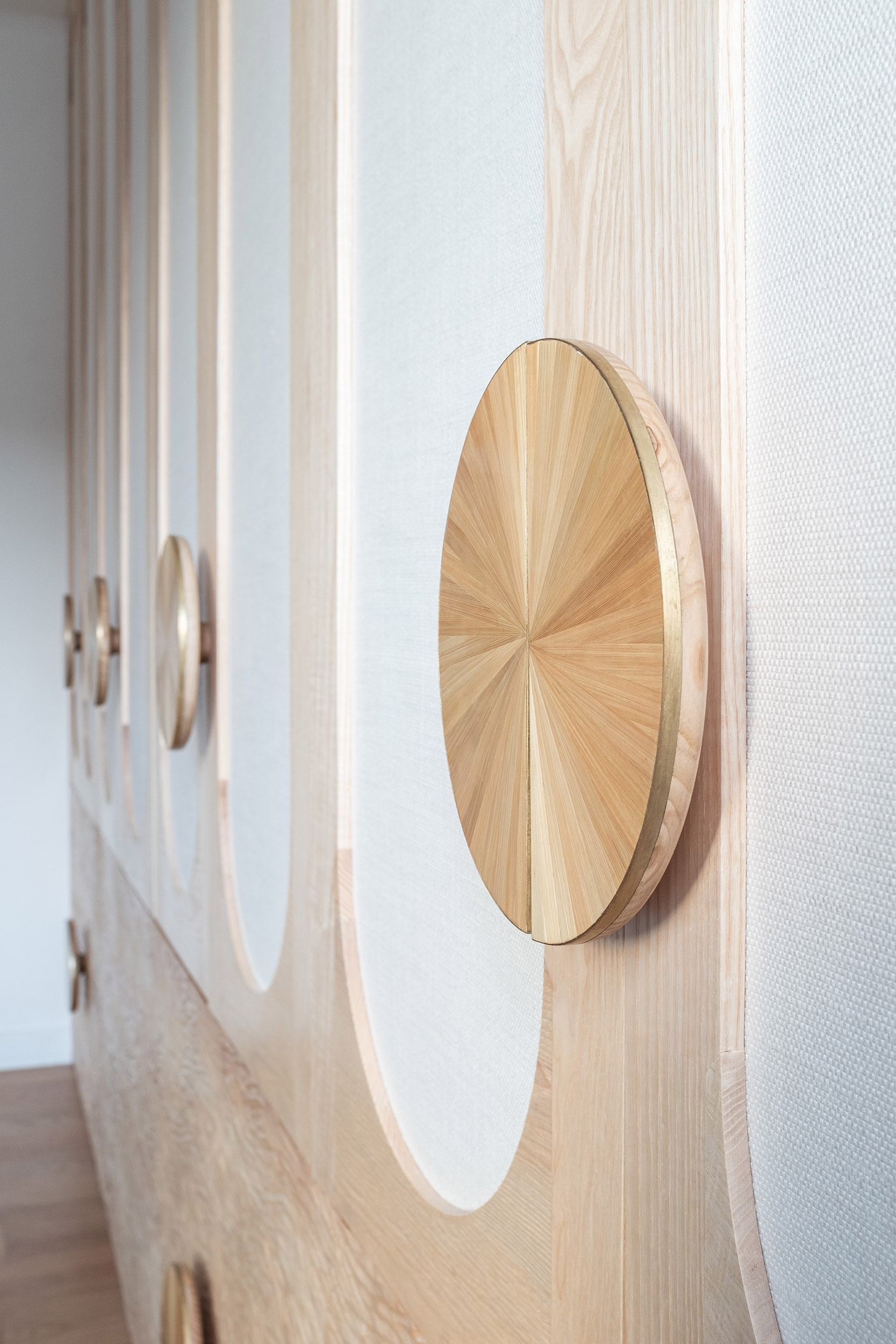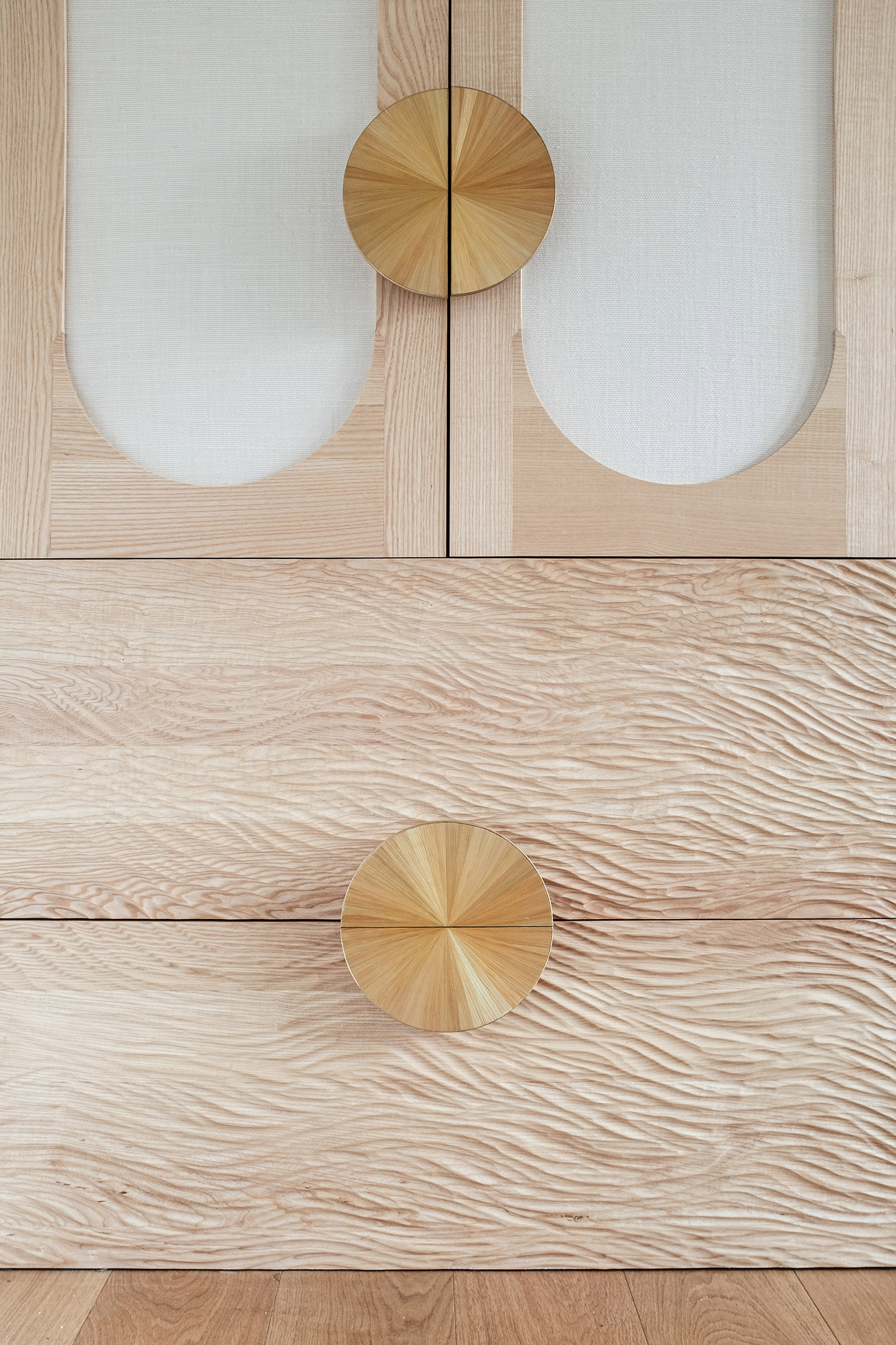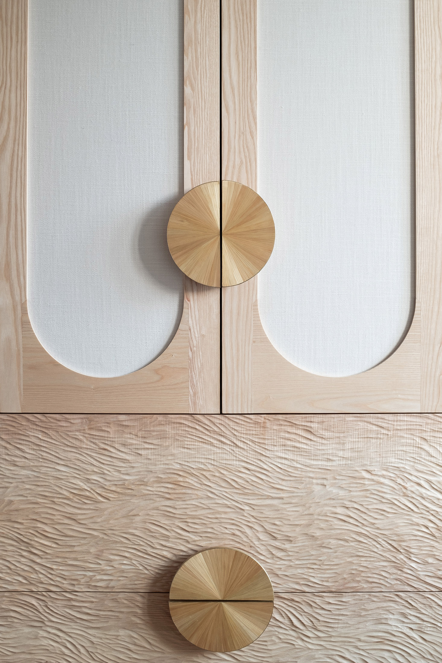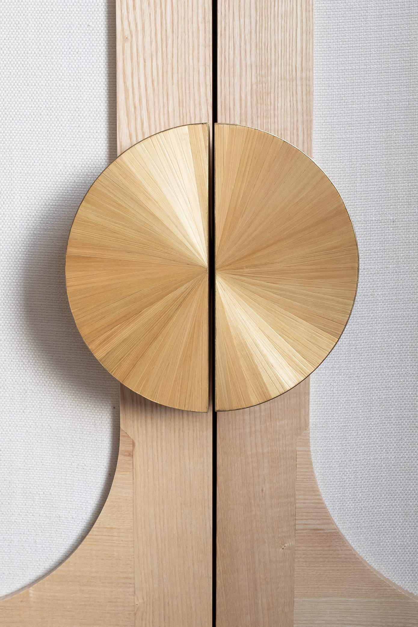 Les poignées, éléments centraux du dressing, sont tournées en frêne massif et habillées de marqueterie de paille, créant un contraste subtil de matières et de finitions, tandis que le laiton assure les liaisons.