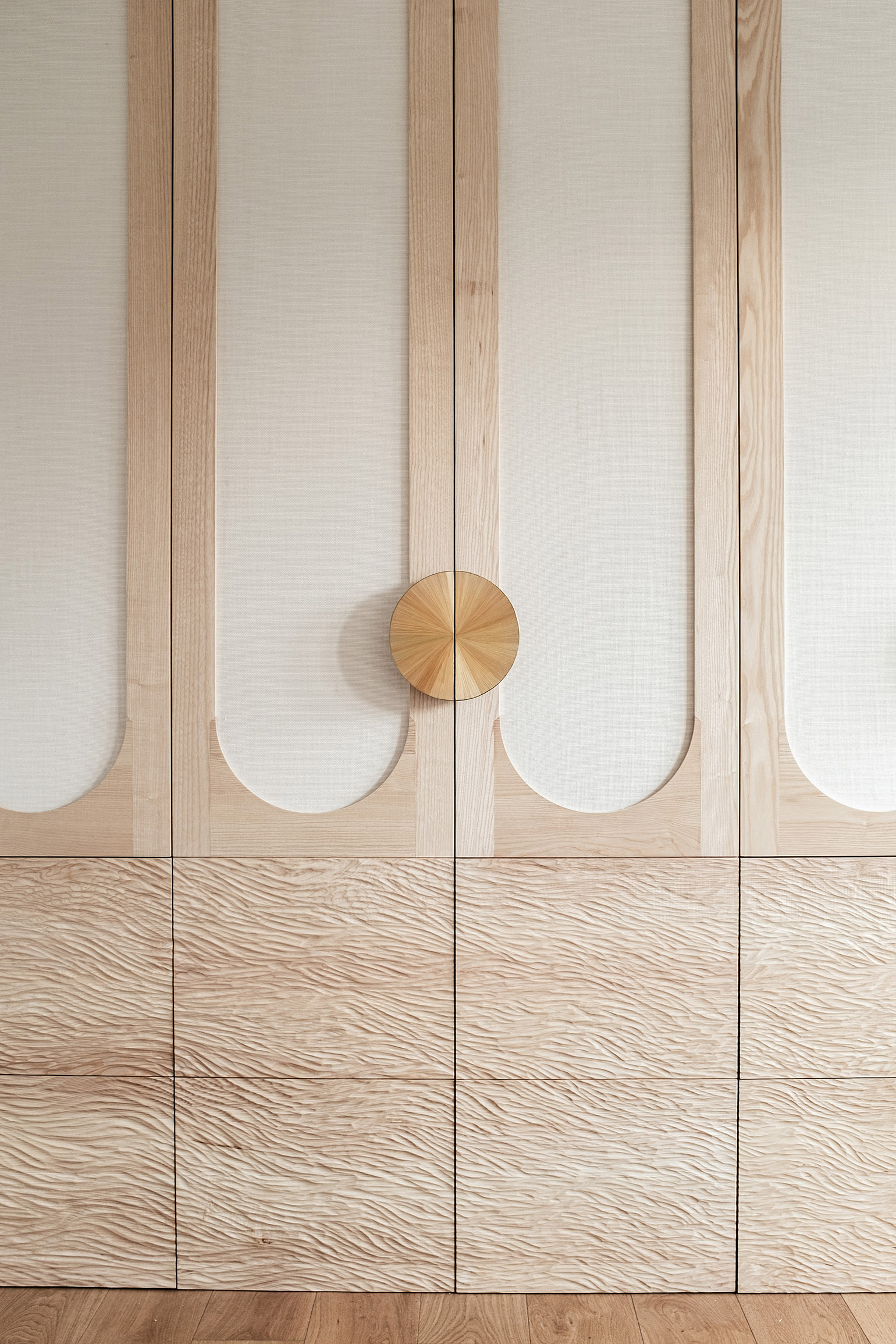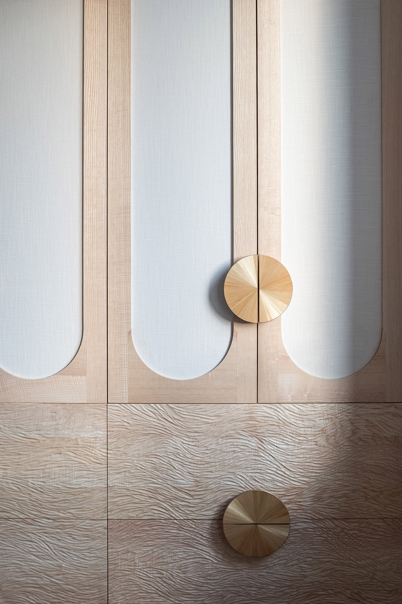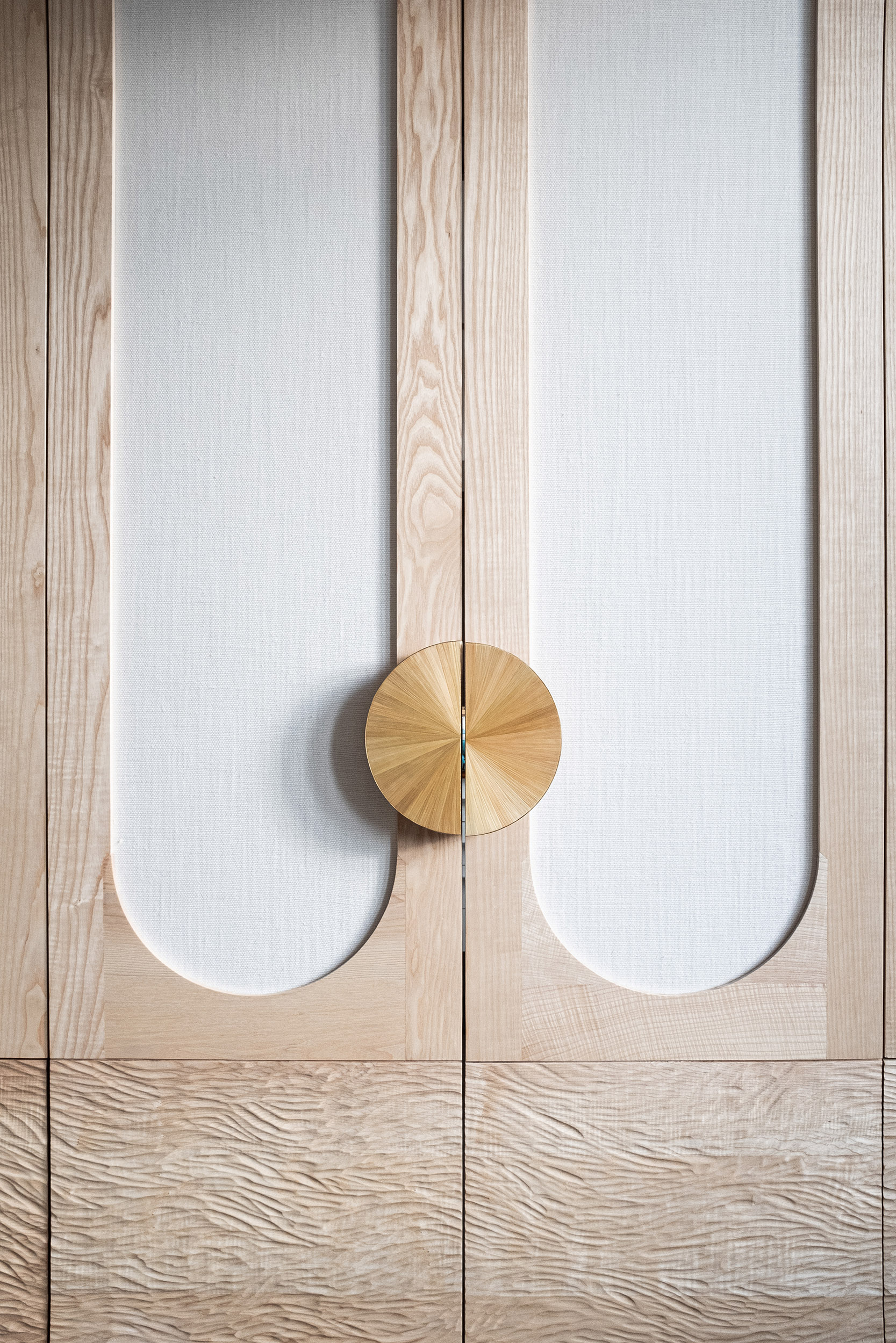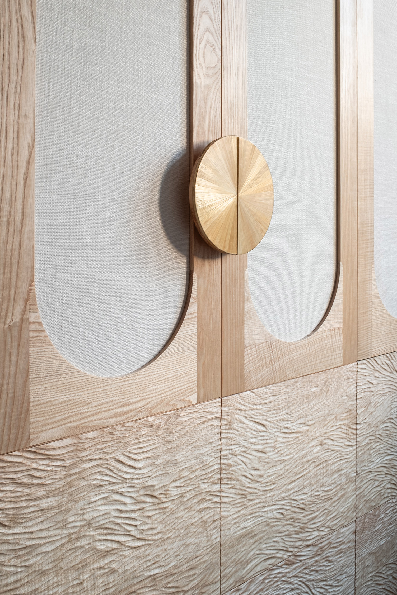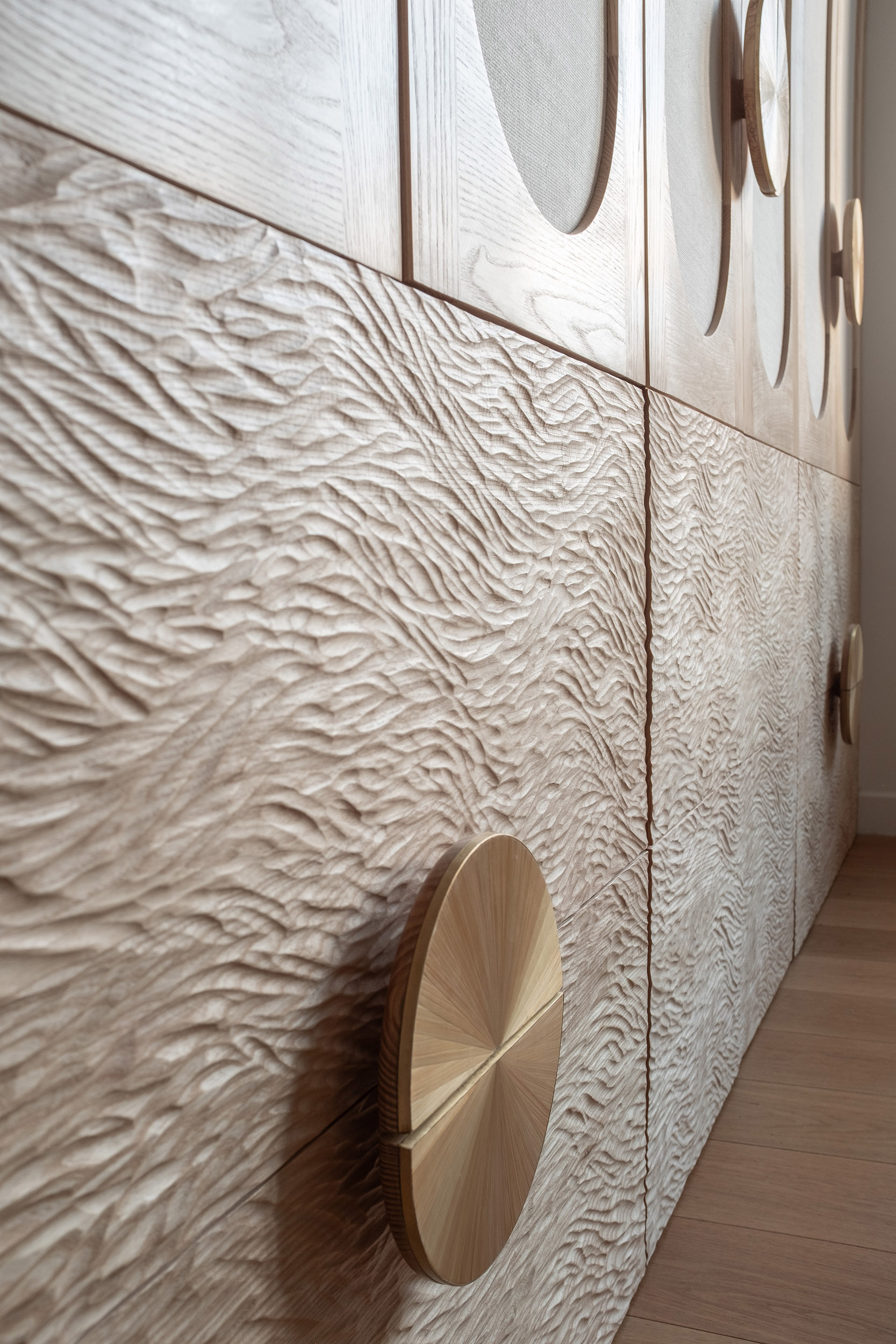 Les poignées, éléments centraux du dressing, sont tournées en frêne massif et habillées de marqueterie de paille, créant un contraste subtil de matières et de finitions, tandis que le laiton assure les liaisons.