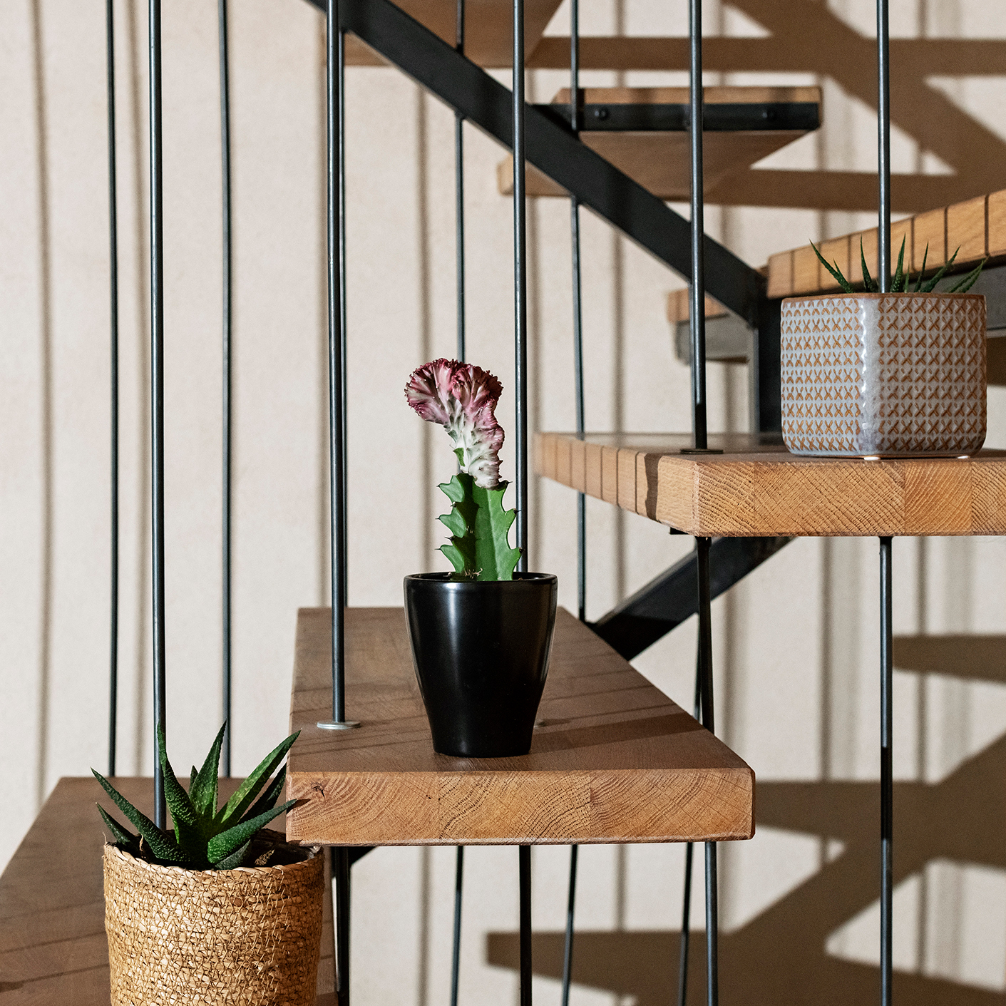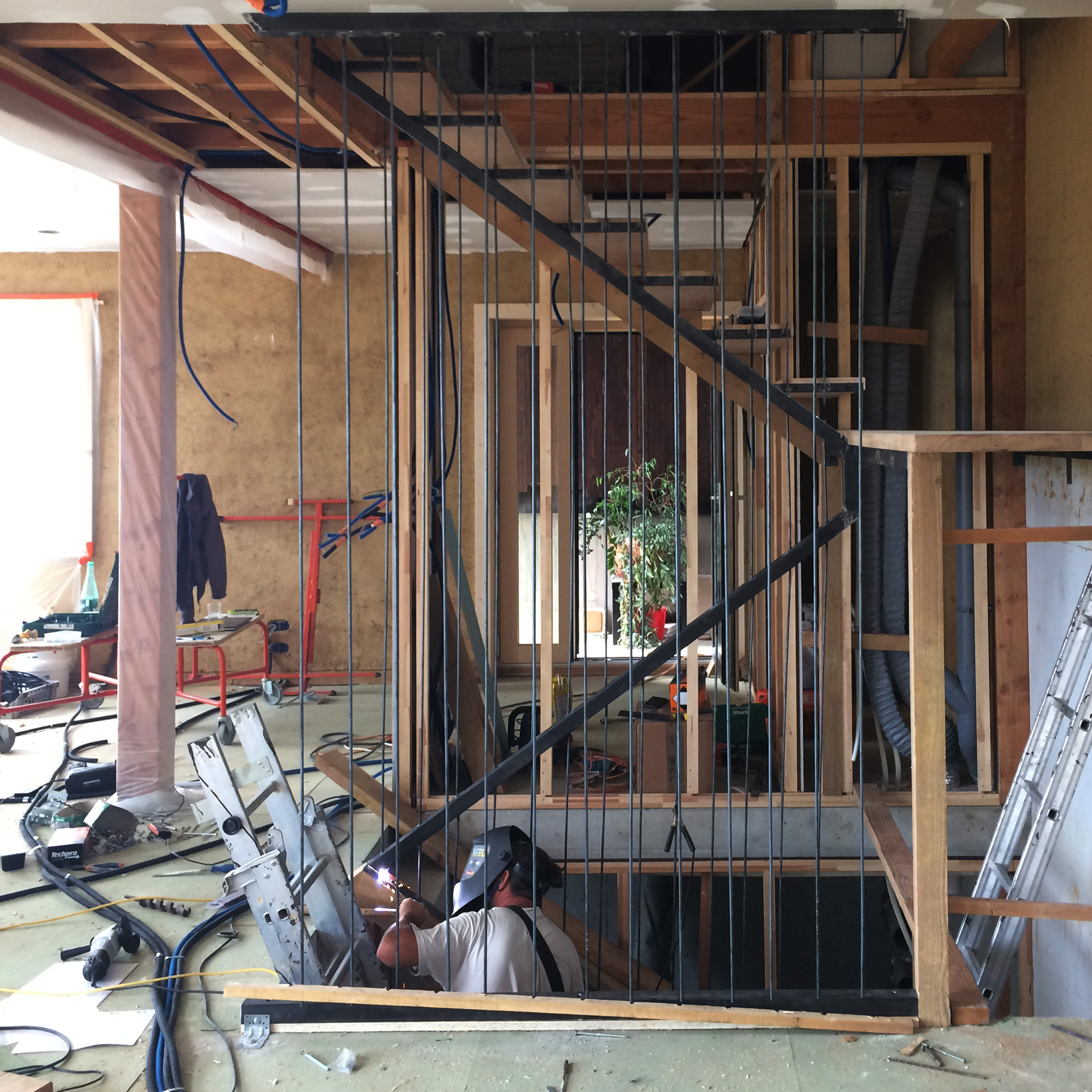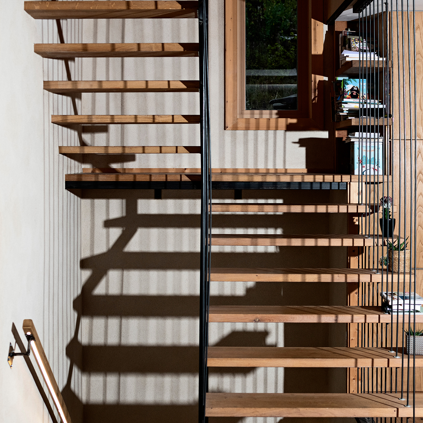 Design et réalisation d’un escalier suspendu en U avec palier et limon caché dans la cloison.